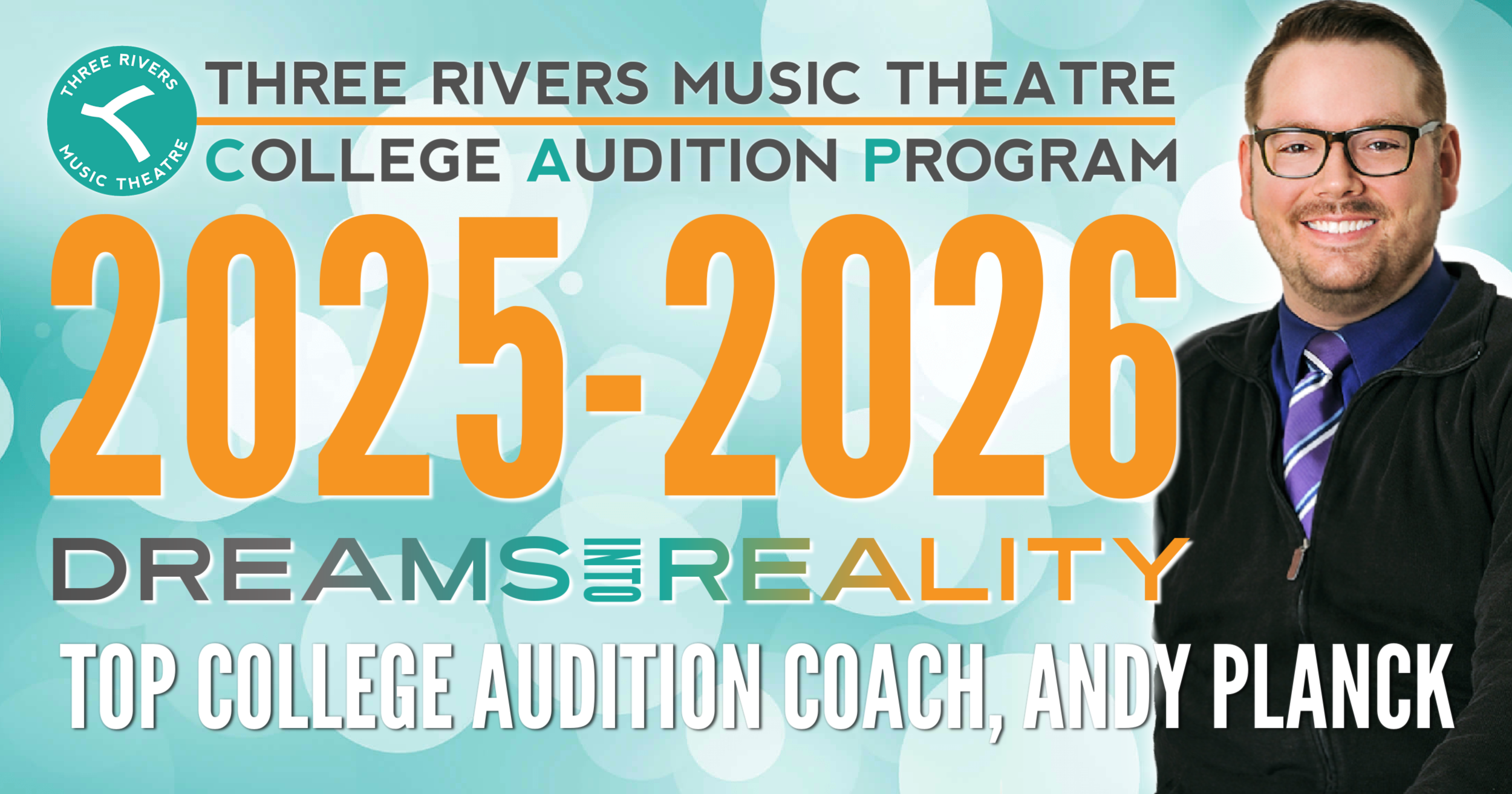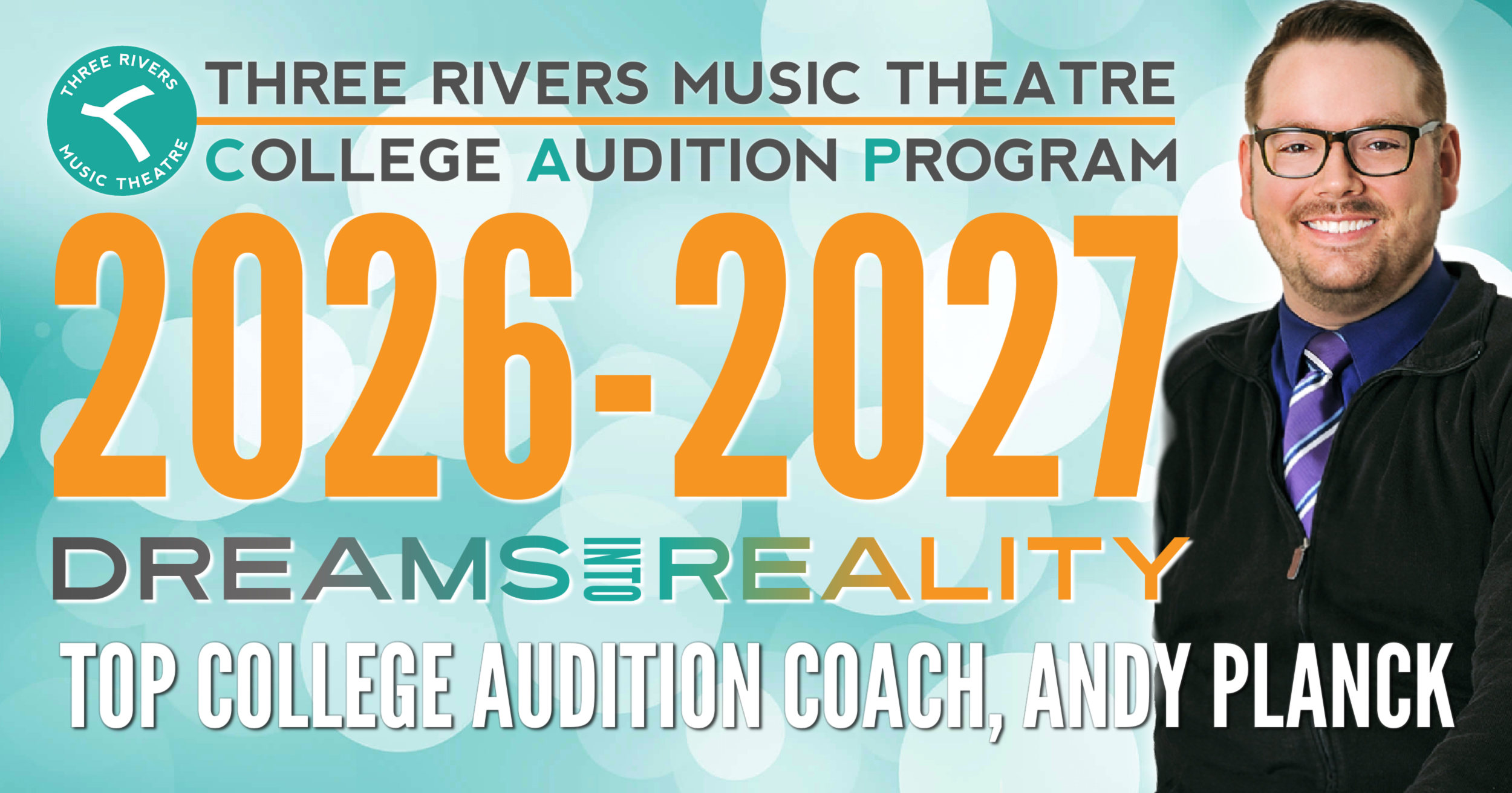 Three Rivers Music Theatre’s COLLEGE AUDITION PROGRAM is for 2026-2027 High School Seniors and Gap Year Students who are preparing to audition for college acting and musical theatre programs. This includes weekly 60-minute Private Coaching Sessions with TRMT Artistic Director and College Audition Coach, Andy Planck. The Three Rivers Music Theatre COLLEGE AUDITION PROGRAM is unique because Andy is with you for the entire college audition journey -- from our first coaching session to the day you make your final decision. Together, we will work through every detail to ensure you walk into auditions with excitement and confidence. Your coaching sessions include: